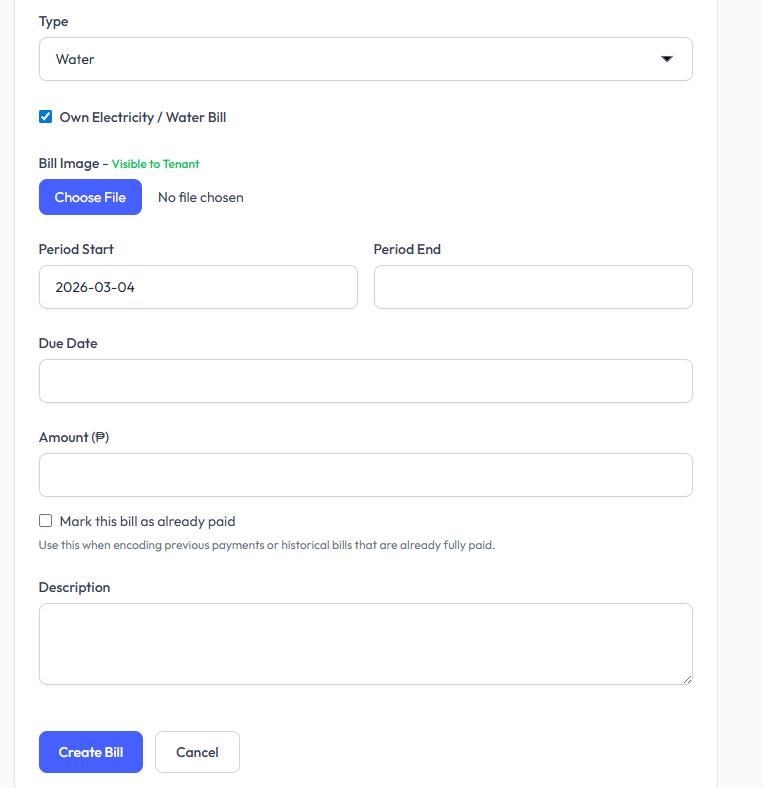 Create a bill for a specific tenant under a listing. You can manually enter utility charges, upload supporting documents, and define billing details such as period, due date, and amount.