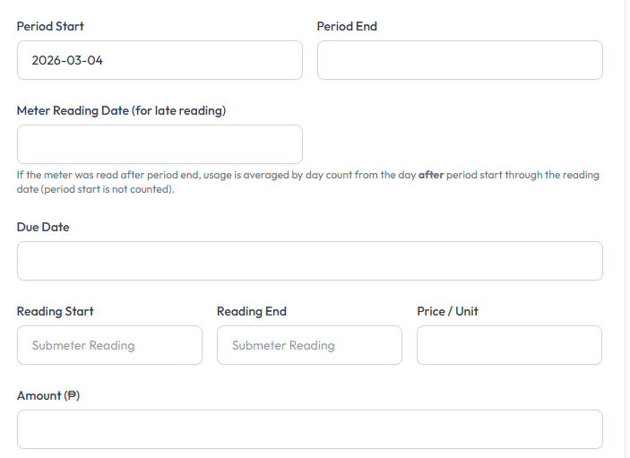 Allows the landlord to manually compute and bill utility usage based on submeter readings. The landlord inputs the reading start and end, and the system calculates the total consumption using the price per unit.