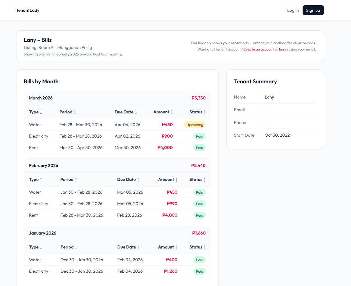 A public shareable link that allows tenants to view their recent bills without logging in. The portal displays only the last 2 months of bills for the specific tenant.