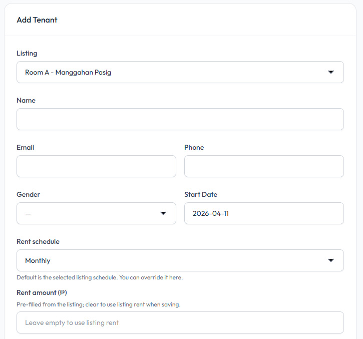 Add a tenant to a listing and set their rent details, payment setup, and initial charges. This allows you to track rent, generate bills, and manage tenant payments