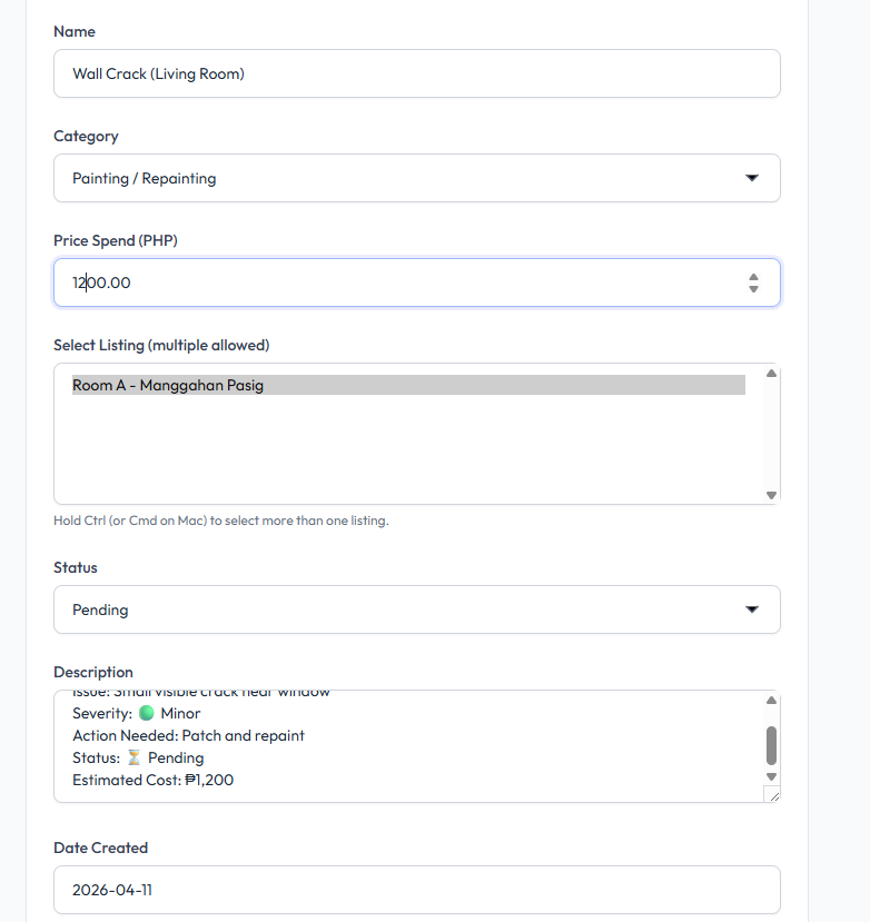 Record and track maintenance work, repairs, or expenses for your properties. This feature allows you to log issues, monitor status, and track costs across one or multiple listings.