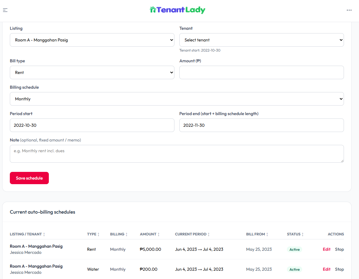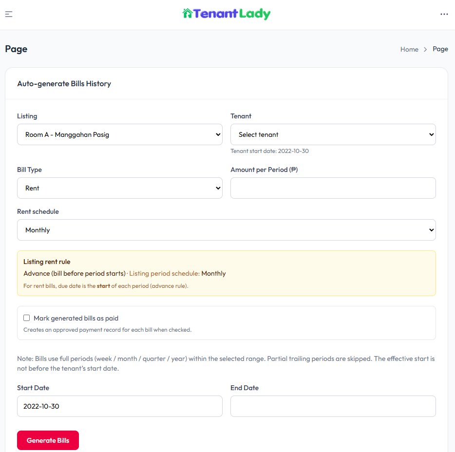 Automatically create past bills for a tenant over a selected date range based on the listing’s rent schedule and rule. This is useful for backfilling records, migrating data, or reconstructing billing history.