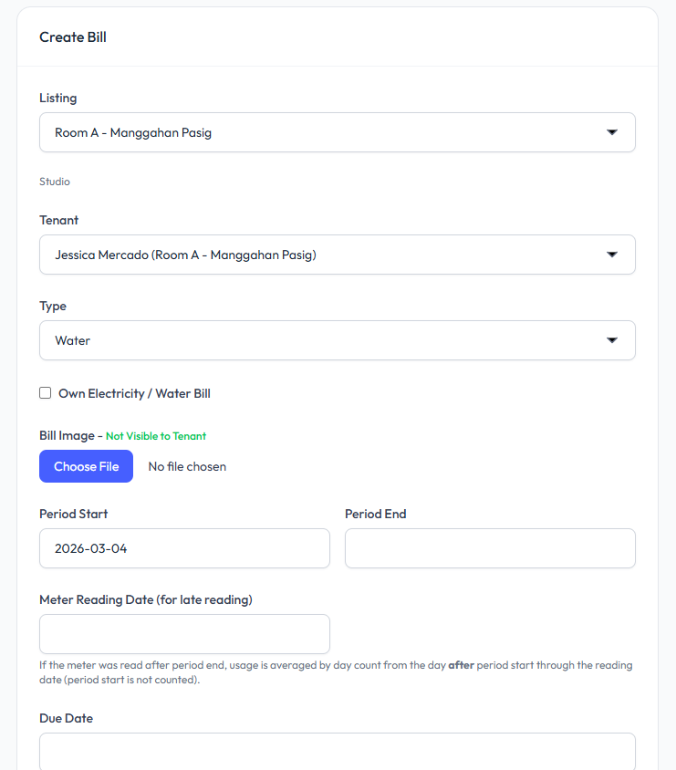 Create a bill for a specific tenant under a listing. You can manually enter utility charges, upload supporting documents, and define billing details such as period, due date, and amount.