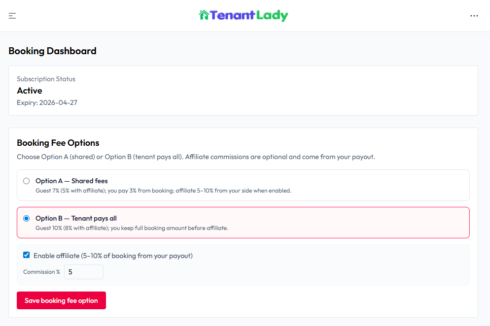 Choose how platform and service fees are applied to bookings. These settings determine how fees are split between you and the tenant (guest) during checkout. All payments are processed in-app and bookings are automatically confirmed after successful payment.