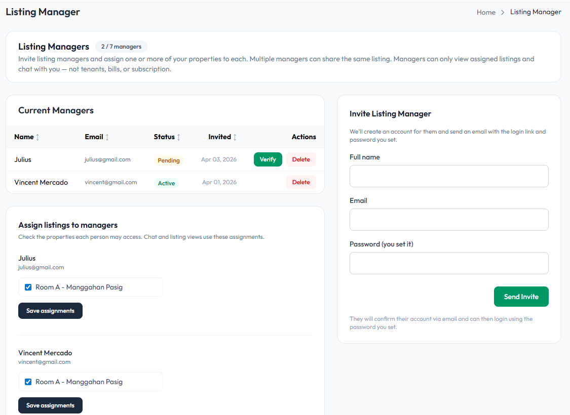 Invite and manage team members who can view and manage assigned property listings. Listing managers have limited access and can only see assigned listings and communicate with you, helping you delegate property oversight securely.