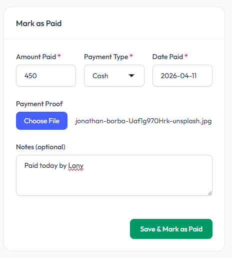 Record a payment for a bill and mark it as paid. This can be done by the tenant or landlord, especially in cases where payment was made offline (e.g., cash) and no online proof is available.